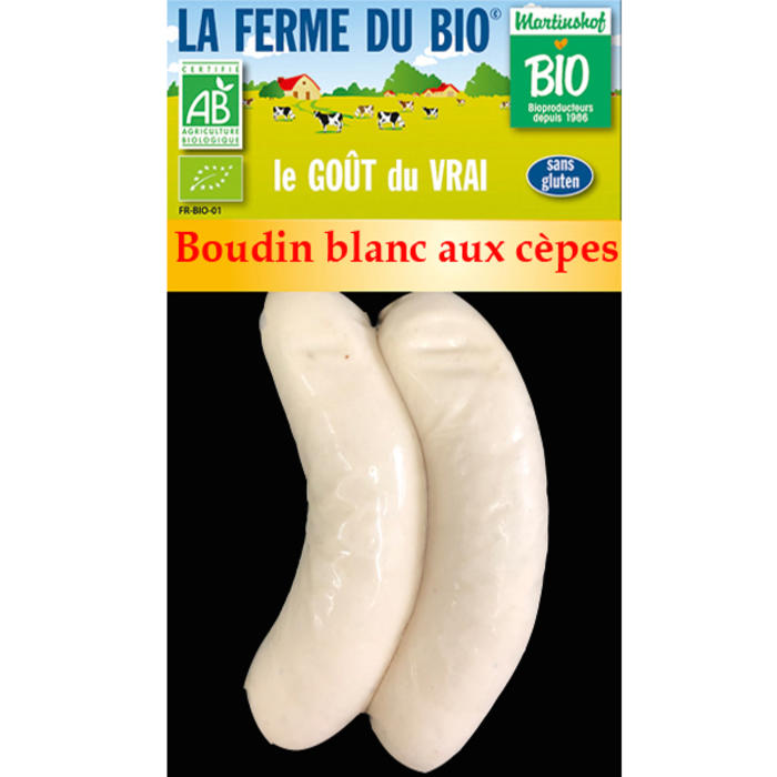 Viande et gras de porc*, Oeufs*, Lait*, Fécule de pomme de terre*, Cèpes*, Sel, Poivre*, Muscade*, Liqueur d'orange*, boyau naturel* *issu de l'agriculture biologique contient du lactose contient des allergènes