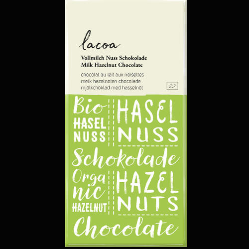 Sucre de canne brut *, beurre de cacao *, NOISETTES *, coupées en deux (20%), lait entier en poudre * (15%), pâte de cacao *, extrait de vanille de bourbon *.