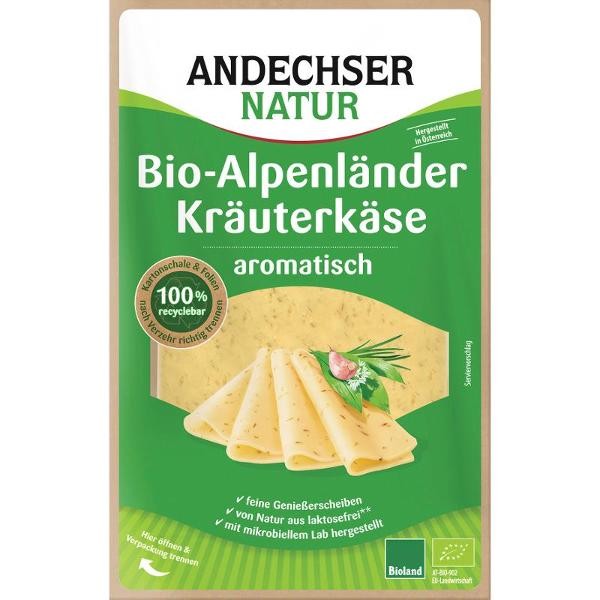 Un fromage Bio de ferme des Alpes Bavaroises; à pâte demi molle en tranches. 150g. Des herbes fraîches telles que l'ortie, la ciboulette et l'ail sont ajoutés ce qui lui donne une saveur merveilleusement fraîche.