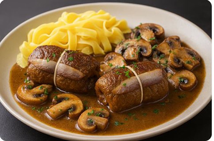 Veau*, porc*, champignons*, Madère, épices*, sel de mer, poivre*